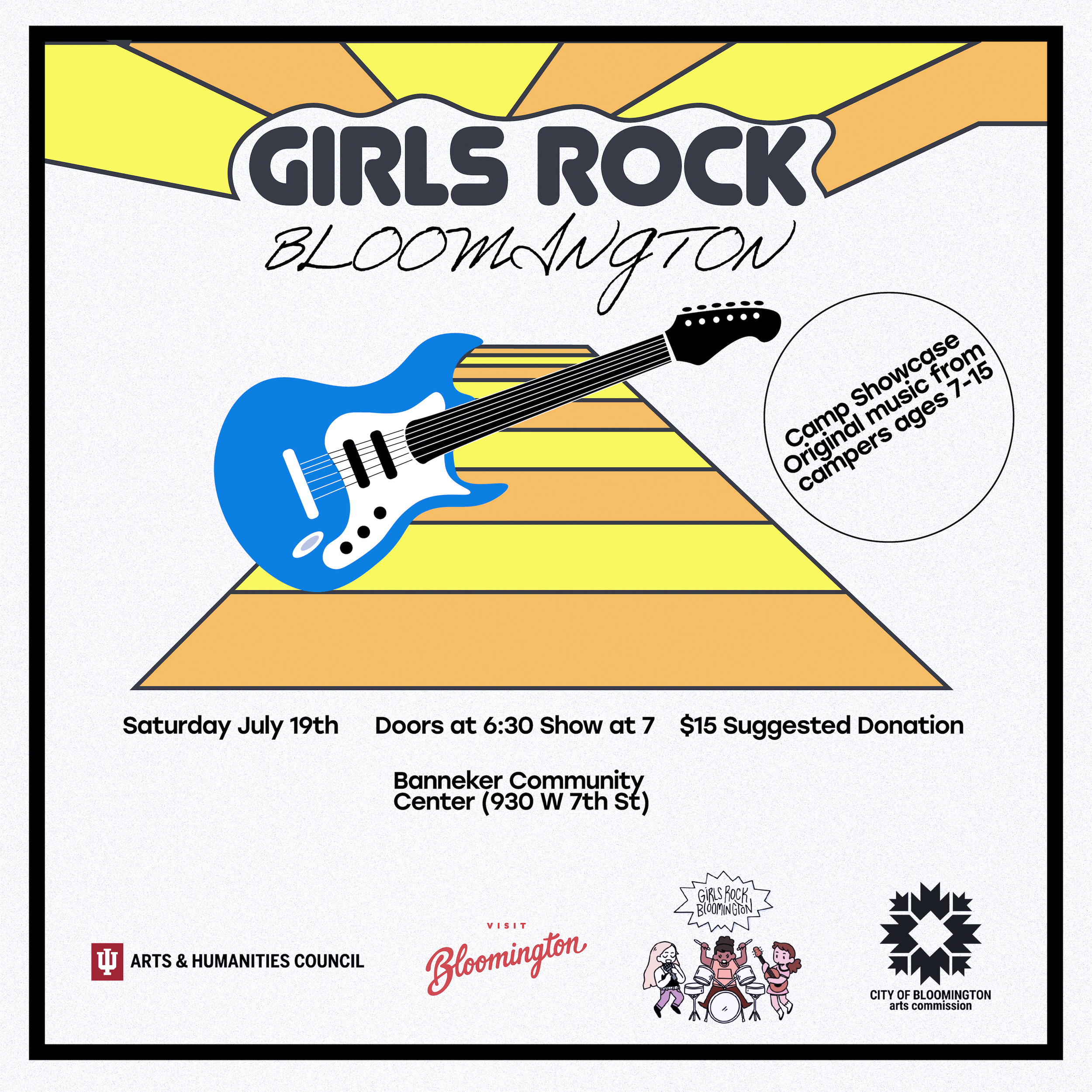 Join us on Saturday July 19th for our Camp Showcase at Banneker Community Center (930 W. 7th St)! Doors open at 6:30, show starts at 7. There will be a Photo Booth, bake sale, mini gear sale, merch table and of course, lots of music from our awesome camp bands! Suggested donation $15.